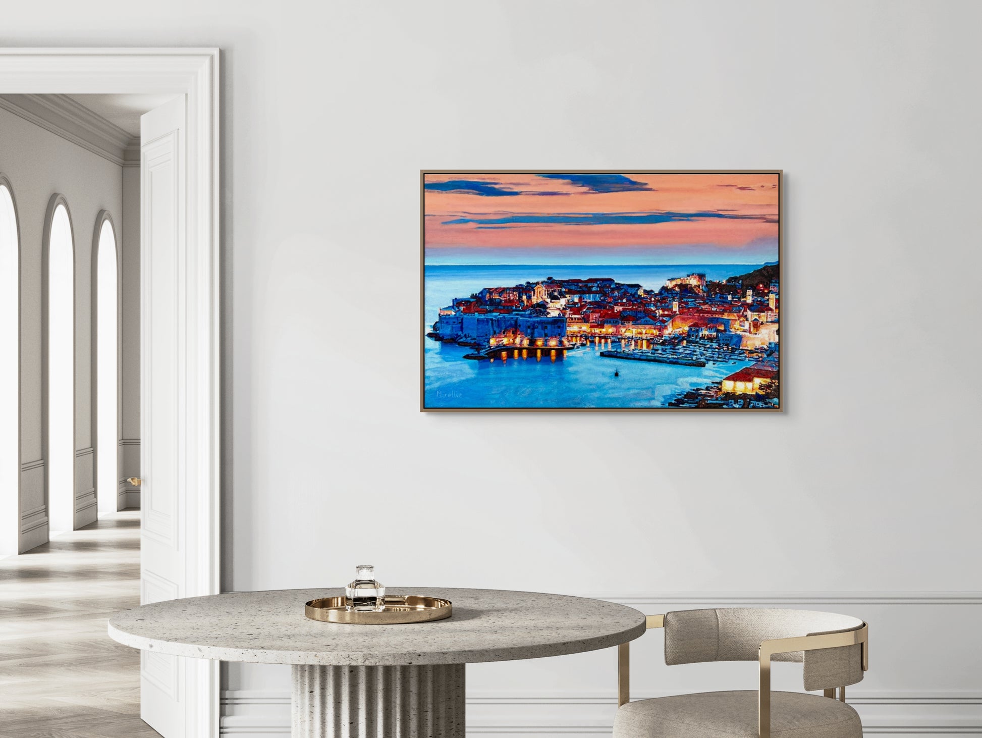 'Dubrovnik at Sunset', digital print of the original oil painting inspired by one of Croatia’s most majestic cities. This painting captures Dubrovnik’s historic stone walls, glowing rooftops and warm evening sky.